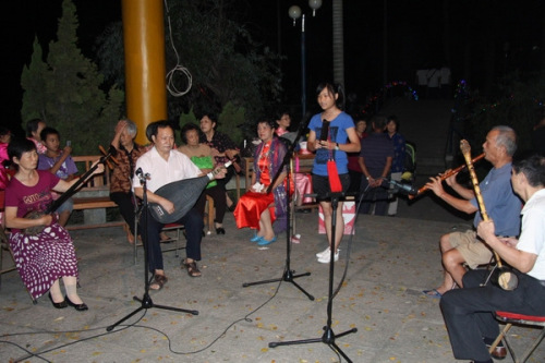 在金川前的小廣場上,文藝晚會依舊豐富多彩,激情動感的舞蹈、詼諧幽默的小品、悠揚美妙的器樂彈唱贏來了一波又一波的掌聲和笑聲。而在秋中湖旁的小涼亭里,有支特別的樂隊也吸引了不少老師學(xué)生駐足聆聽,他們是由華僑大學(xué)退休教職工組成的南音演奏社。老人家們彈著琵琶,吹著筒蕭,拉著二弦三弦,吟唱一首又一首韻味悠長的南音樂曲。來自橋南小學(xué)的幾名學(xué)生也來助陣,老少合作的表演別樣溫馨。今年已經(jīng)七十一歲的張彬彬女士表示,他們同是喜愛南音的老職工,她退休以來已經(jīng)學(xué)了七八年的南音了,能把南音這一傳統(tǒng)文化傳播給更多人,他們都很開心。