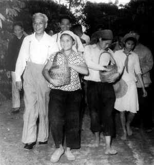 畫面上,曾六妹(前方穿花格衣服者)和她的同學(xué)張桂嬌提著滿藍(lán)的咖啡果走在前面,兩人還不時(shí)交流勞動(dòng)心得,而劉少奇則像一位和藹的長(zhǎng)者,慈祥地跟在她們身后。
