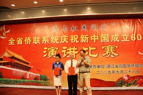 為慶祝新中國成立六十周年,浙江省僑聯(lián)于9月28日下午,在浙江圖書館二樓報告廳舉辦了以“僑與祖國同行”為主題的全省僑聯(lián)系統(tǒng)演講比賽活動,由各市僑聯(lián)推薦的、來自全省僑界各行各業(yè)的19名參賽選手參加了比賽活動。