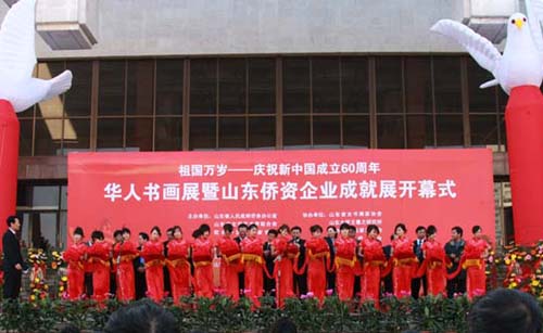 王琳在致辭中說(shuō),“祖國(guó)萬(wàn)歲——慶祝新中國(guó)成立60周年華人書畫展暨山東僑資企業(yè)成就展”大型宣傳展覽活動(dòng),是山東僑界的一項(xiàng)盛事,也是向新中國(guó)60華誕和全運(yùn)會(huì)成功舉辦的獻(xiàn)禮。此次展覽展示的丹青墨寶,主要是西班牙、荷蘭、意大利、奧地利、法國(guó)、德國(guó)、美國(guó)、日本等國(guó)家華僑華人書畫家和國(guó)內(nèi)知名書畫藝術(shù)家的代表作,具有很高的藝術(shù)造詣和感染力。