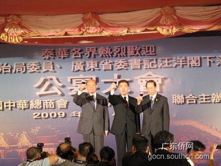 汪洋在歡迎宴會(huì)上致辭。汪洋說,今天是廣東與泰國(guó)友好往來的一個(gè)重要日子,在泰國(guó)各界朋友,廣大鄉(xiāng)親的支持和參與下,今天上午舉行的2009中國(guó)“2009中國(guó)(廣東)-泰國(guó)經(jīng)貿(mào)合作洽談會(huì)”取得了圓滿的成功。今晚,在美麗的曼谷,華僑華人社團(tuán)和廣大鄉(xiāng)親舉行盛大宴會(huì)歡迎廣東代表團(tuán),使我們深深感受到廣大鄉(xiāng)親對(duì)祖籍國(guó)濃厚的思鄉(xiāng)情懷,對(duì)廣東人民的友好情義。在此,我僅代表廣東省委省政府向在座的各位嘉賓,并通過你們向廣大旅泰華僑華人致以誠(chéng)摯的問候和良好的祝愿。