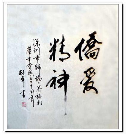 根據(jù)年初深圳市僑聯(lián)常委會的會議精神及市歸僑僑眷福利基金會的工作計劃,基金會將舉辦市歸僑僑眷福利基金會20周年紀(jì)念活動,以對所有支持關(guān)心過基金會的領(lǐng)導(dǎo)和社會知名人士表示感謝,并出一本基金會紀(jì)念冊,以紀(jì)念基金會成立以來的風(fēng)雨歷程。當(dāng)參加廣東省第九次僑代會的廣東省僑聯(lián)常委、深圳市歸僑僑眷福利基金會副理事長劉偉良邀請林軍為市歸僑僑眷福利基金會題詞時,林軍欣然應(yīng)允,當(dāng)即揮筆疾書“僑愛精神”,為市歸僑僑眷福利基金會成立20 周年獻(xiàn)禮。