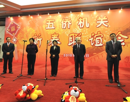 中新網(wǎng)2月12日電 據(jù)中國僑聯(lián)網(wǎng)消息,虎步奔騰開勝景,春風(fēng)浩蕩展鴻圖。2月8日下午,首都大酒店洋溢著節(jié)日的喜慶氣氛。中央“五僑”機(jī)關(guān)在這里隆重舉行2010年新春聯(lián)歡會!拔鍍S”機(jī)關(guān)干部職工和離退休老干部400多人歡聚一堂,喜迎新春佳節(jié)。