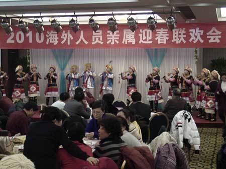 由澳洲海外親屬自行排演的15人的葫蘆絲演奏拉開文藝節(jié)目演出的帷幕。精彩的節(jié)目給觀眾以美好的藝術(shù)享受。演出期間還穿插了各片區(qū)海外親屬會員集體對海外游子的美好祝福。20個形式多樣的文藝節(jié)目全部由海外親屬自排自演,充分展示了他們的才華。
