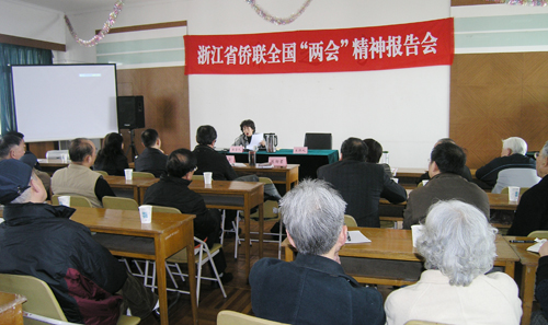 中國僑聯(lián)副主席、浙江省僑聯(lián)黨組書記王成云,浙江省僑聯(lián)副主席林東,在杭的浙江省“兩會”僑界代表、委員,在杭的部分歸僑僑眷、留學人員及家屬、省僑聯(lián)委員,省、杭州市僑聯(lián)機關干部及退休老干部等共60余人參加了報告會。浙江省僑聯(lián)主席吳晶主持了報告會。