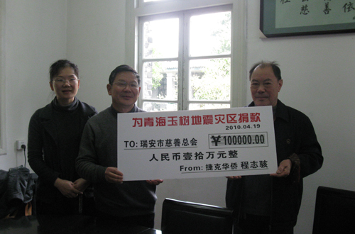中新網(wǎng)4月20日電 據(jù)瑞安市僑聯(lián)消息,青海玉樹縣的地震震撼了每個中國人,也揪緊了千里之外瑞安僑胞的心。4月19日凌晨5時多,浙江省瑞安市寧益鄉(xiāng)僑聯(lián)主席吳勝運(yùn)接到瑞安籍捷克僑領(lǐng)程志駭?shù)碾娫,說自己有一筆10萬元的玉樹賑災(zāi)捐款將由他的岳父葉余積轉(zhuǎn)交給瑞安市僑聯(lián)。