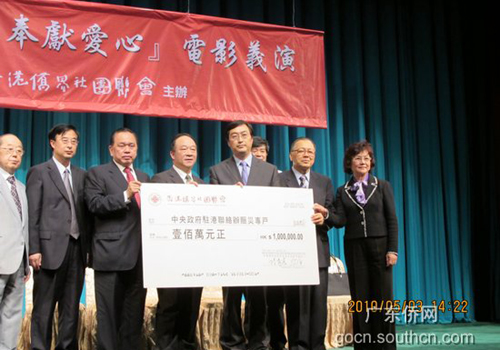 中新網(wǎng)5月6日電 據(jù)廣東僑網(wǎng)消息,5月3日,香港僑界社團(tuán)聯(lián)會(huì)舉行“情系玉樹(shù) 奉獻(xiàn)愛(ài)心 電影義演”暨向玉樹(shù)地震災(zāi)區(qū)捐款儀式,廣東省僑辦主任吳銳成應(yīng)邀出席并講話(huà)。