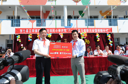 朱奕龍深情地說:和老師同學(xué)們一樣,每一個“六一”,既是你們最快樂的節(jié)日,也是我最高興、最幸福的日子。因為10年前,從銀帝集團成立那天起,我就給自己定下了一個目標(biāo)——每年捐建2所希望小學(xué)。如今,10年過去了,我很榮幸并很負責(zé)任地向大家報告,已經(jīng)有60多所奕龍希望小學(xué)扎根全國、全區(qū)各地,我相信不久的將來,還有更多的希望小學(xué)矗立在寧夏山川。2003年,我在黃河岸邊捐建了民樂奕龍小學(xué),吸引了社會上更多關(guān)注教育、關(guān)注孩子們的眼光,更多的教育資金投向了這里。同時,看到一批批學(xué)生從這里走進了更高的學(xué)府,我是多么的高興啊!2008年政治局委員、國務(wù)委員劉延?xùn)|在教育部部長周濟、自治區(qū)黨委書記陳建國、自治區(qū)人民政府主席王正偉等領(lǐng)導(dǎo)視察了民樂奕龍僑心希望小學(xué),對我也是極大的鼓舞。聽說今年4月,民樂奕龍在“寧夏希望工程20年”典型表彰活動中,又連獲“模范希望小學(xué)”、“希望工程優(yōu)秀教師”、“希望之星”三項提名獎,我為廣大老師和學(xué)校取得的榮譽感到非常的高興,為你們?nèi)〉玫某煽兏械綗o比的驕傲和自豪。今天看著學(xué)校優(yōu)良的設(shè)施建設(shè),優(yōu)美的教學(xué)環(huán)境,我深感欣慰,更為默默無聞、辛勤工作、無私奉獻的教師們感到敬佩。你們長期為了教育事業(yè)工作在鄉(xiāng)村,對艱苦的生活環(huán)境和生活狀況無怨無悔,令我非常感動。