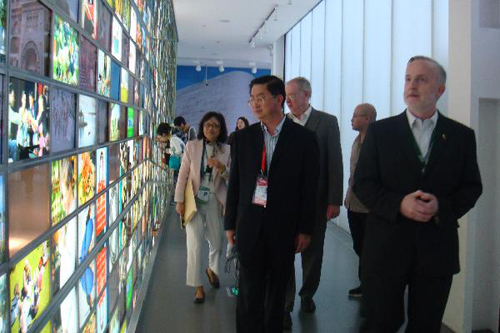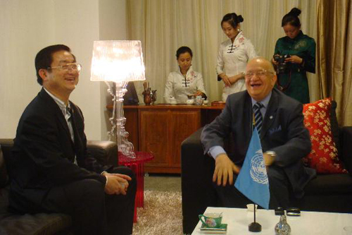 在聯(lián)合國館項目服務(wù)商、美國全美蘇浙同鄉(xiāng)總會會長朱元忠的陪同下,崔明華一行又參觀了上海世博會聯(lián)合國館,并體驗了在聯(lián)合國館內(nèi)舉行的中國茶藝表演,并于聯(lián)合國副秘書長阿瓦尼·貝南進行了親切的會談。崔明華最后也在留言薄上題詞:“和諧之理念,發(fā)展之動力!